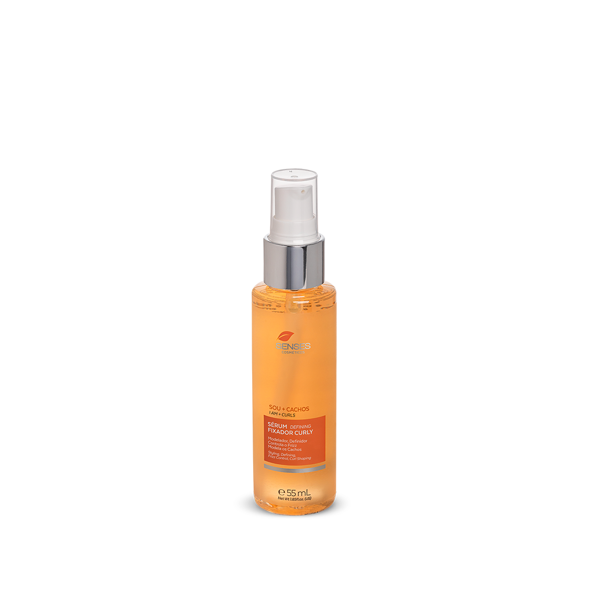 O Sérum Fixador Curly Sou + Cachos prolonga a definição, controla o frizz e modela os cachos.